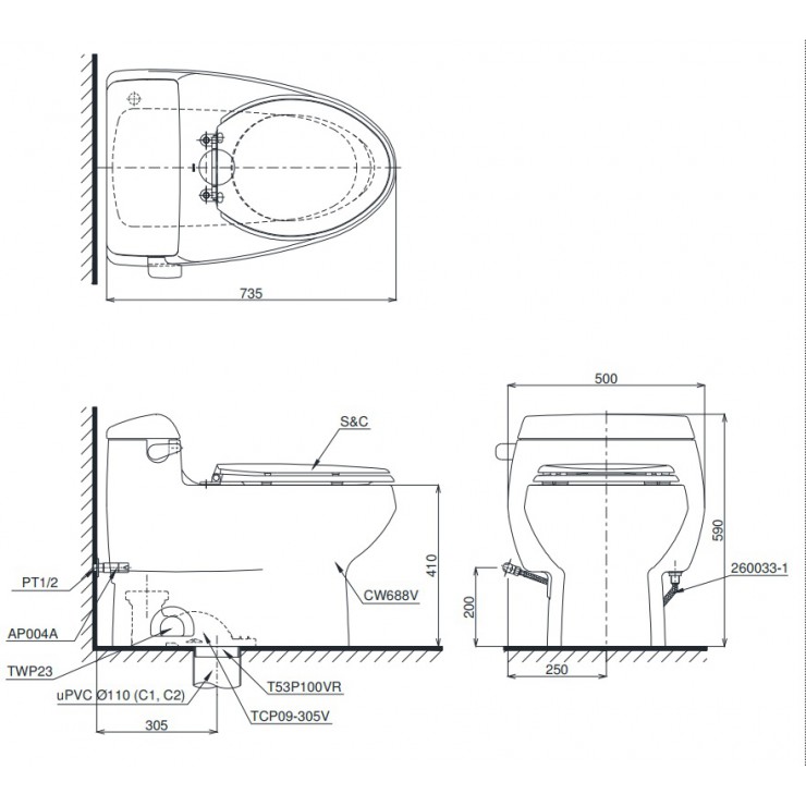 Bản vẽ bồn cầu MS688 nắp rửa cơ TCW07S TOTO