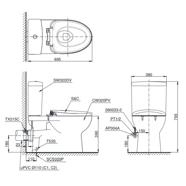 Bản vẽ bàn cầu TOTO CS 320 PDRT3 thoát vào tường