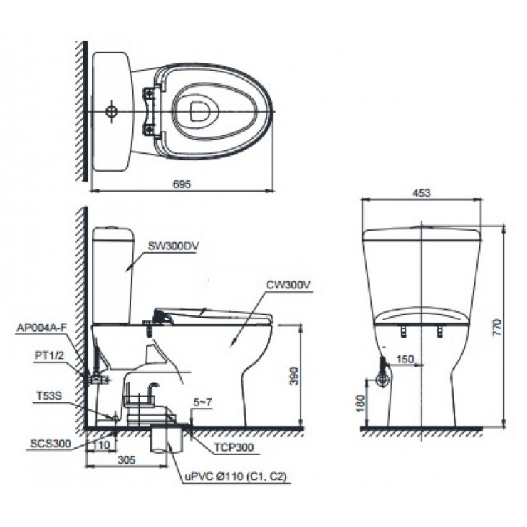 Bản vẽ kích thước bồn cầu điện tử CS300DRW7#W TOTO