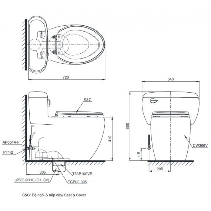 Bản vẽ kích thước bồn cầu TOTO MS366W14