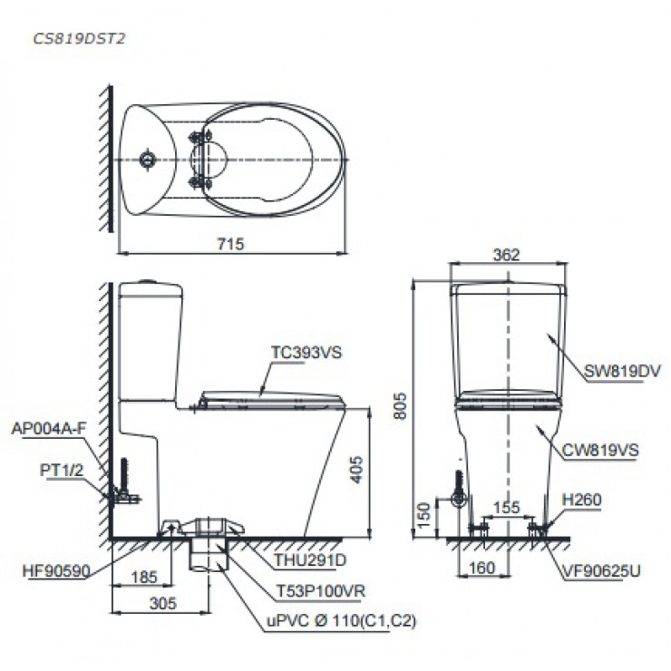 Bản vẽ kỹ thuật xí bệt TOTO CS819DST2