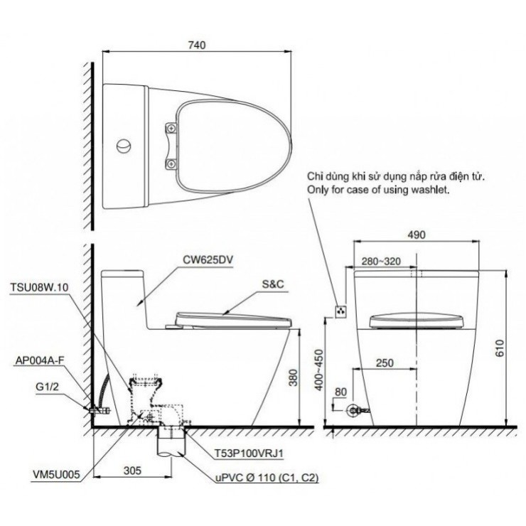 • Phù hợp lắp đặt với nắp rửa điện tử WASHLET (tùy chọn)