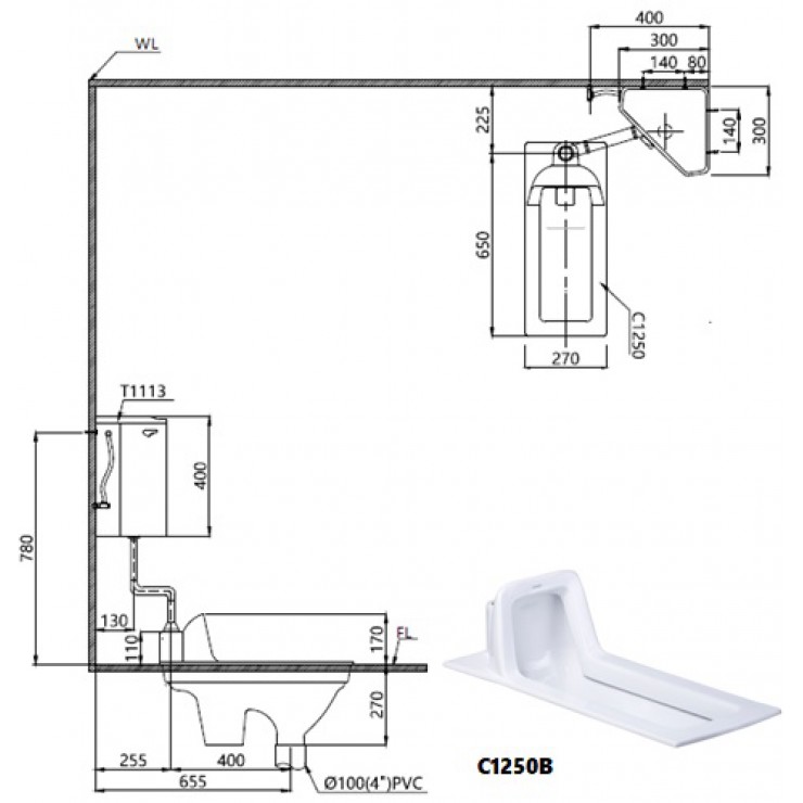 - Tâm thoát: C1250 / 65.5cm